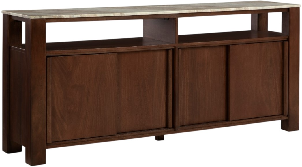 High style and functionality? Check and check. This accent cabinet's taupe, white and gray marble top and contrasting dark brown finish bring the wow factor. Sliding doors open to reveal shelves that are perfect for hiding everyday clutter.Read More